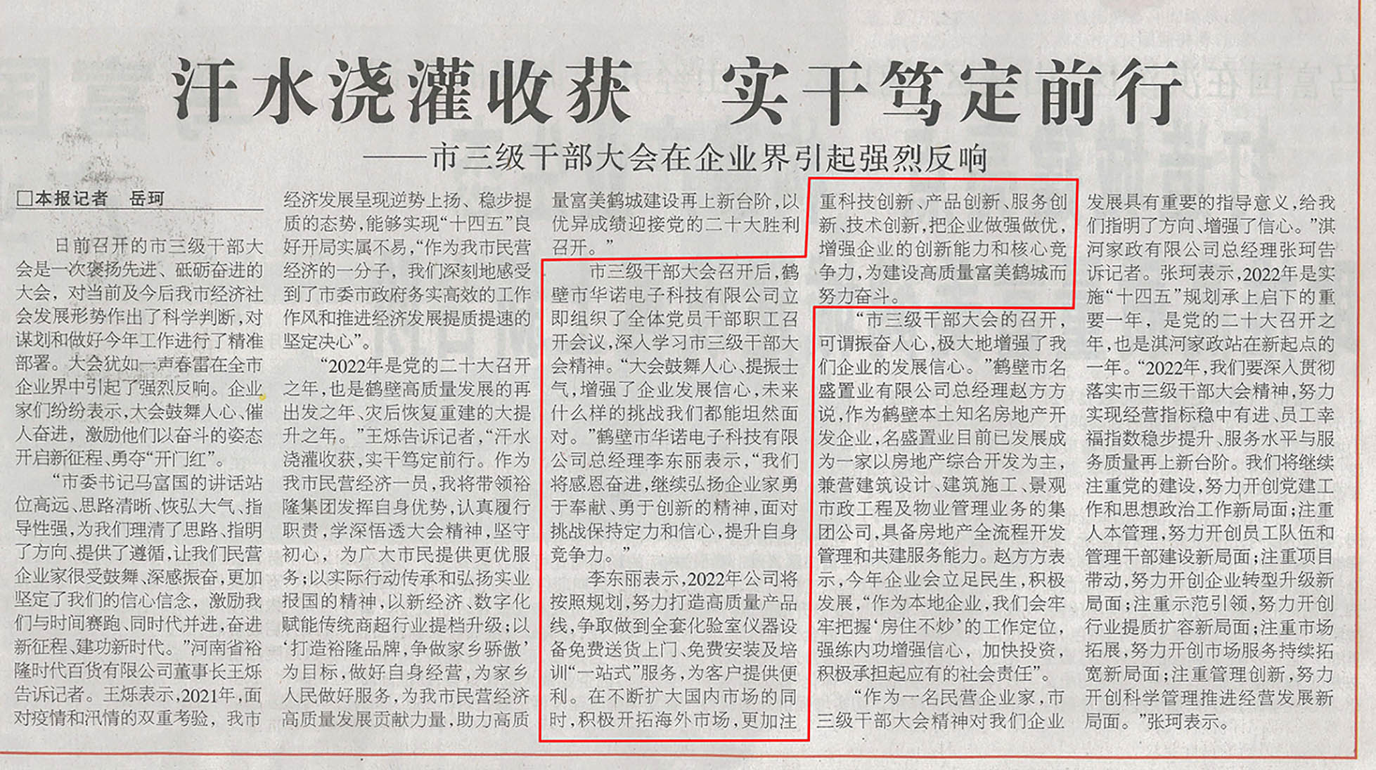 近日,為學習貫徹鶴壁市三級干部大會精神,鶴壁市華諾電子科技有限公司全體黨員干部積極參加。作為煤炭化驗設備行業優秀企業,鶴壁日報針對此次會議對華諾電子進行報道。
