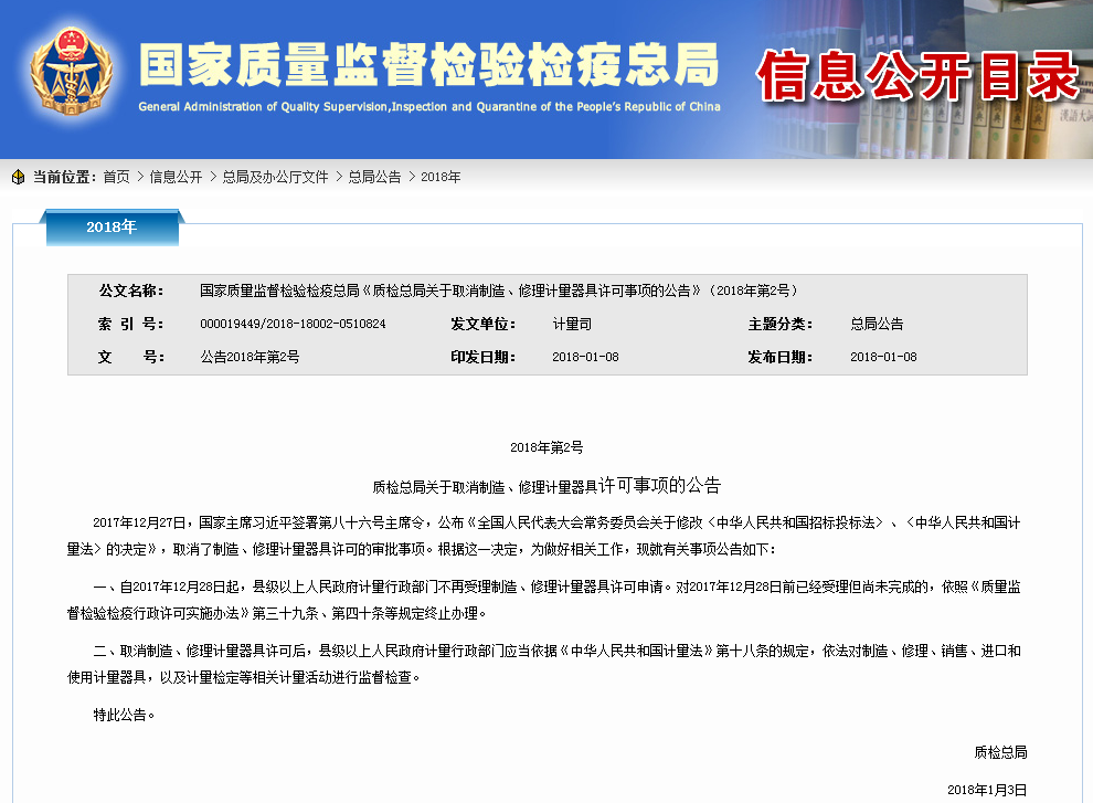 最新消息!質檢總局關于取消制造、修理計量器具許可事項的公告