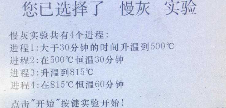 打開灰揮測定儀主界面選擇慢灰實(shí)驗(yàn),進(jìn)入慢灰實(shí)驗(yàn)界面。待爐溫小于100℃,打開爐門將裝有煤樣的灰皿(分析煤樣重量:1±0.1g)送入爐內(nèi)恒溫區(qū),打開煙筒,關(guān)閉爐門且安裝灰份座(使?fàn)t門保留15mm縫隙),點(diǎn)擊開始按鈕。進(jìn)程顯示“1”,爐內(nèi)溫度開始慢慢上升。當(dāng)溫度到達(dá)499℃后自動(dòng)進(jìn)入進(jìn)程2,在500℃恒溫30min。時(shí)間到后自動(dòng)進(jìn)入進(jìn)程3,爐溫繼續(xù)從500℃升到815℃。溫度達(dá)到后自動(dòng)進(jìn)入進(jìn)程4,在815℃溫度下恒溫1h,時(shí)間滿足后,慢灰實(shí)驗(yàn)結(jié)束,蜂鳴器智能提醒,點(diǎn)擊結(jié)束按鈕,結(jié)束本次實(shí)驗(yàn)。打開爐門將試樣平穩(wěn)取出。
